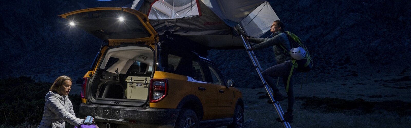 On the move, the Bronco™ Sport roof-rack structure can handle up to a 150-lb. dynamic load and a 600-lb. static load with the standard steel roof. In order to avoid damp ground or pesky critters, the high load capacity also gives you the ability to elevate your campsite.